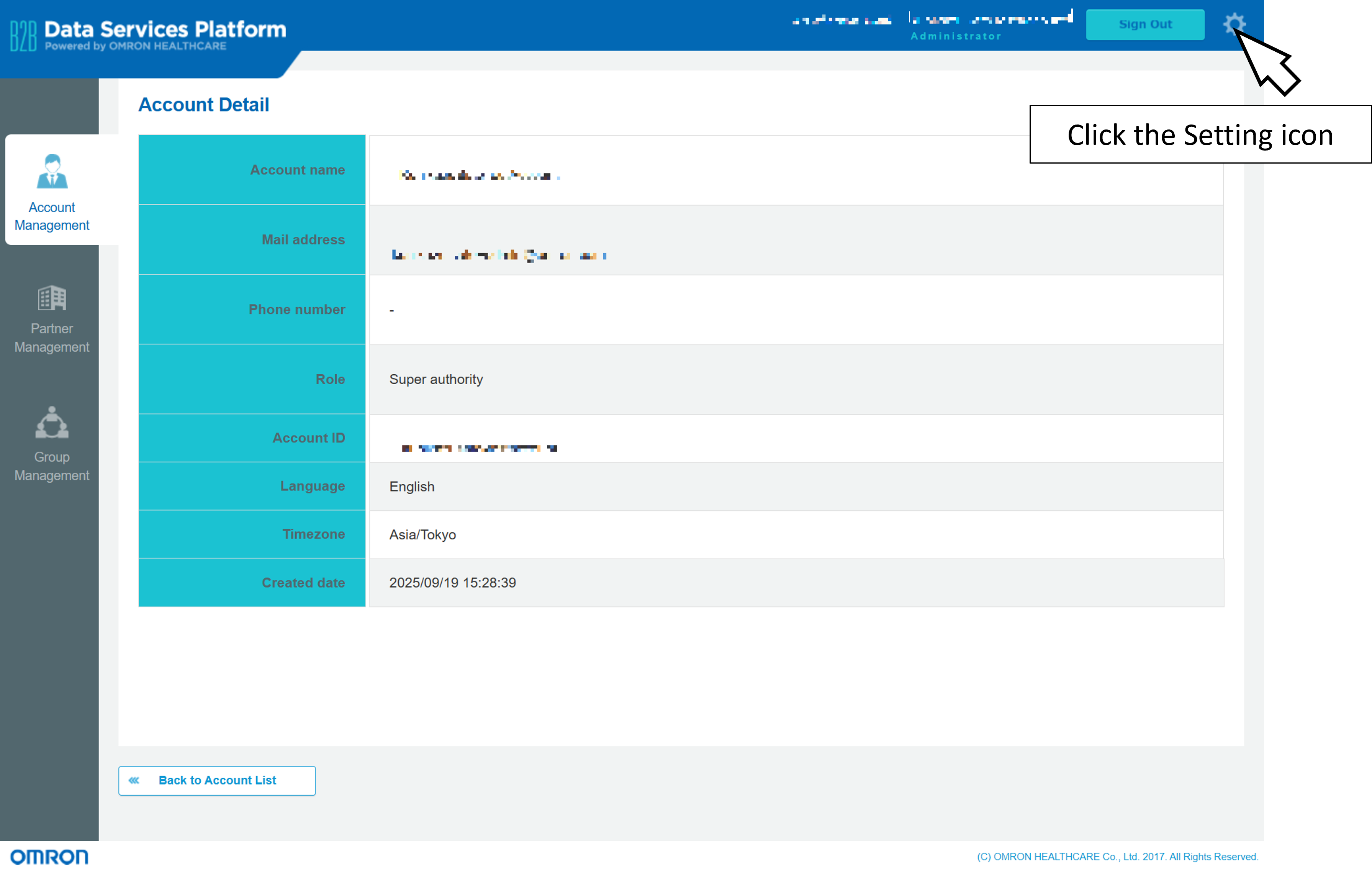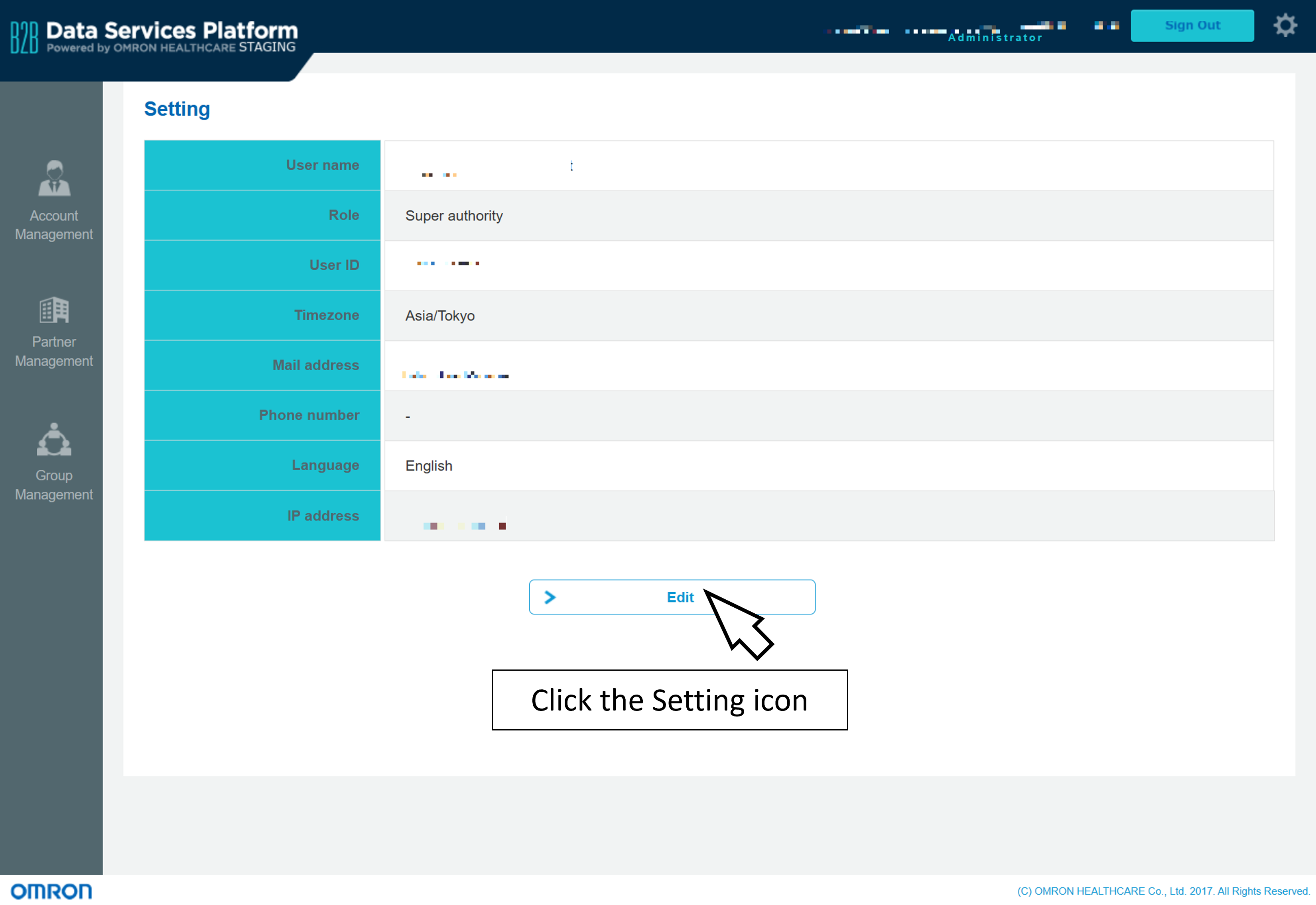 Registered account information can be updated as follows. After logging in to the admin console, click the 'Settings (gear) icon' in the upper-right corner to open the Personal Settings page. Click 'Edit' at the bottom of the page to update the items listed below.