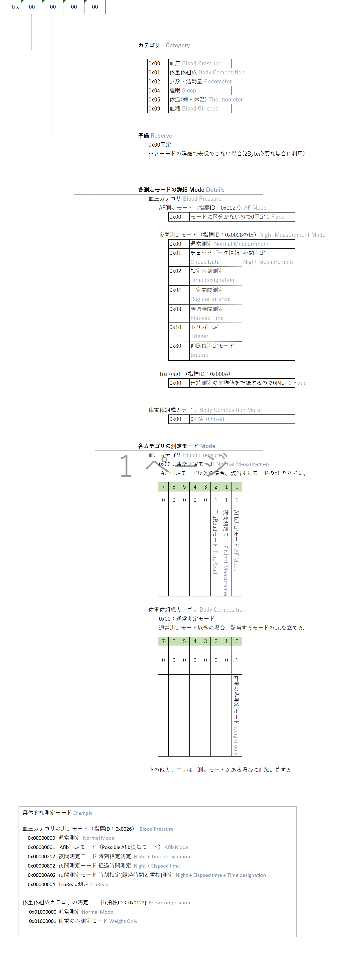 As the "measurement mode" for the entire blood pressure category, assign the indicator ID: 0x0026 (decimal 38) / measurement mode to the measurement data. To distinguish between Afib measurement mode, nighttime measurement mode, and TruRead measurement mode, set the value for this indicator ID according to the following specifications based on each measurement mode: